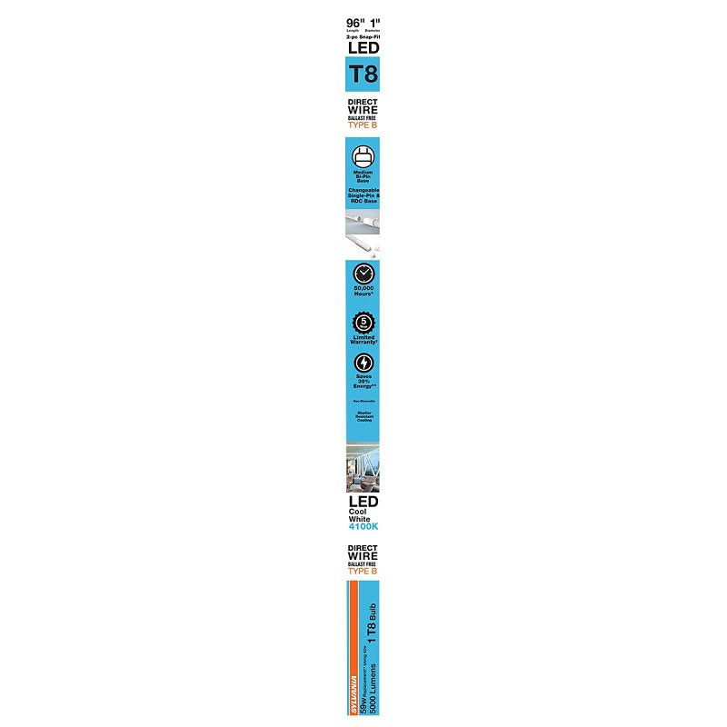 The Sylvania 41098 LED bulb is a linear T8 lamp designed to provide efficient lighting solutions for various applications. With its cool white light at a color temperature of 4100 K, this bulb is perfect for illuminating workspaces, offices, and retail areas. Its long average life of 50,000 hours ensures that you will enjoy bright, reliable lighting for years to come.