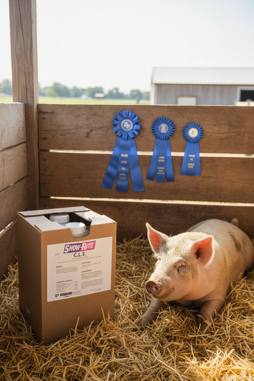 Show-Rite CLE Oil is a premium livestock supplement designed to enhance the overall condition and appearance of show animals. This product is formulated to provide essential nutrients that support optimal growth and development in livestock, making it ideal for use in show preparation. It is typically used in the weeks leading up to livestock shows to help achieve a healthy, vibrant look.